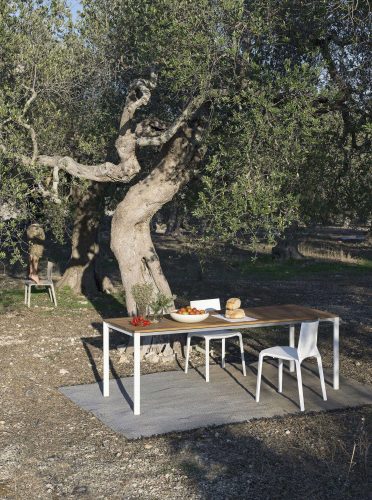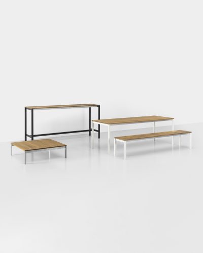 Ein vollständiges Programm von Tischen, Bänken und Beistelltischen für den Outdoor-Bereich, zu dem auch ein Bartisch oder eine Theke gehören. Alle Modelle zeichnen sich durch ein essenzielles und vielseitiges Design aus, mit Querstreben aus eloxiertem Aluminium und Beinen aus verzinktem Stahl oder aus Stahl mit Epoxidpulverbeschichtung, die auch mit Höhe nach Maß erhältlich sind. Die Lattenrostplatte ist in Teak, Aluminium und der neuen Argilla-Ausführung erhältlich.