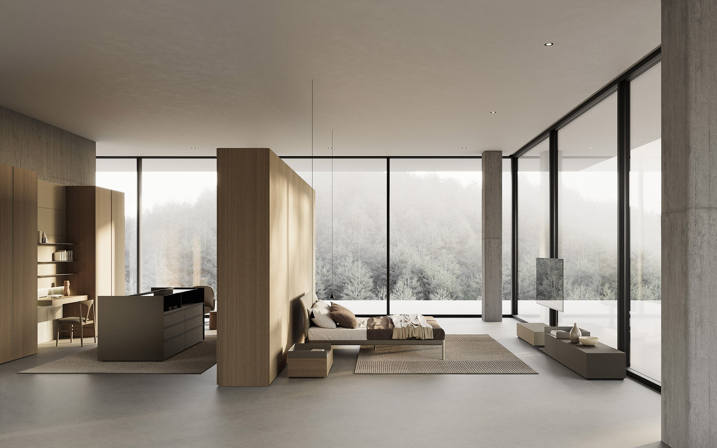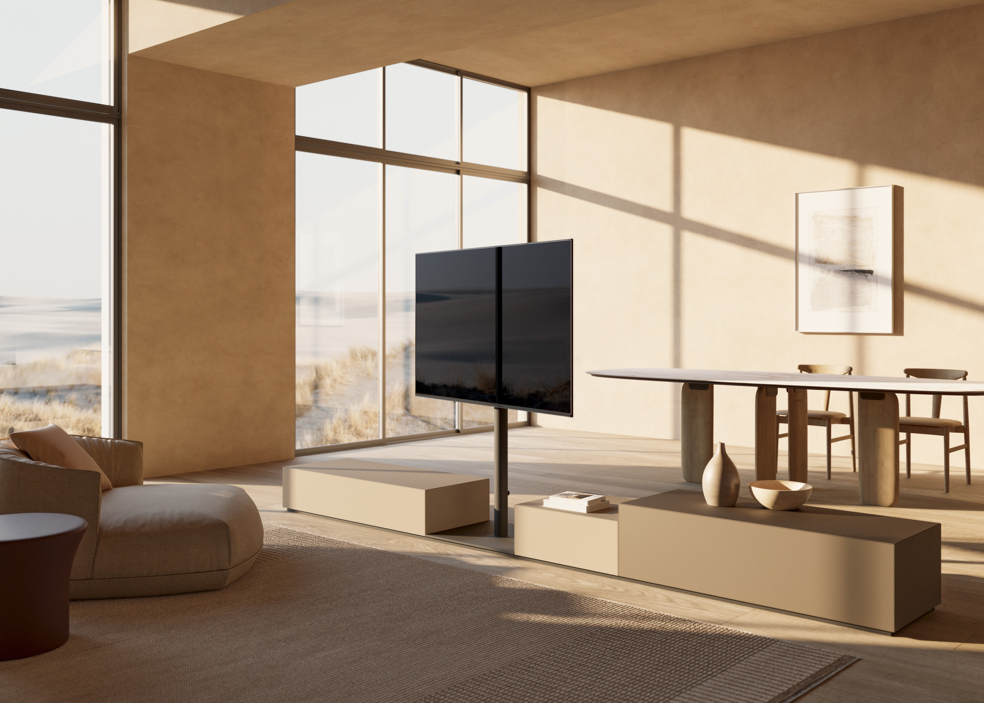 Tvu ist ein TV-Ständer für Flachbildschirme, eine drehbare Stahlstruktur mit einem Fach für die Kabelführung. Es interagiert mit dem Aufbewahrungssystem Avenue Cabinets für Kompositionen in der Mitte des Raumes oder zur Wandmontage.