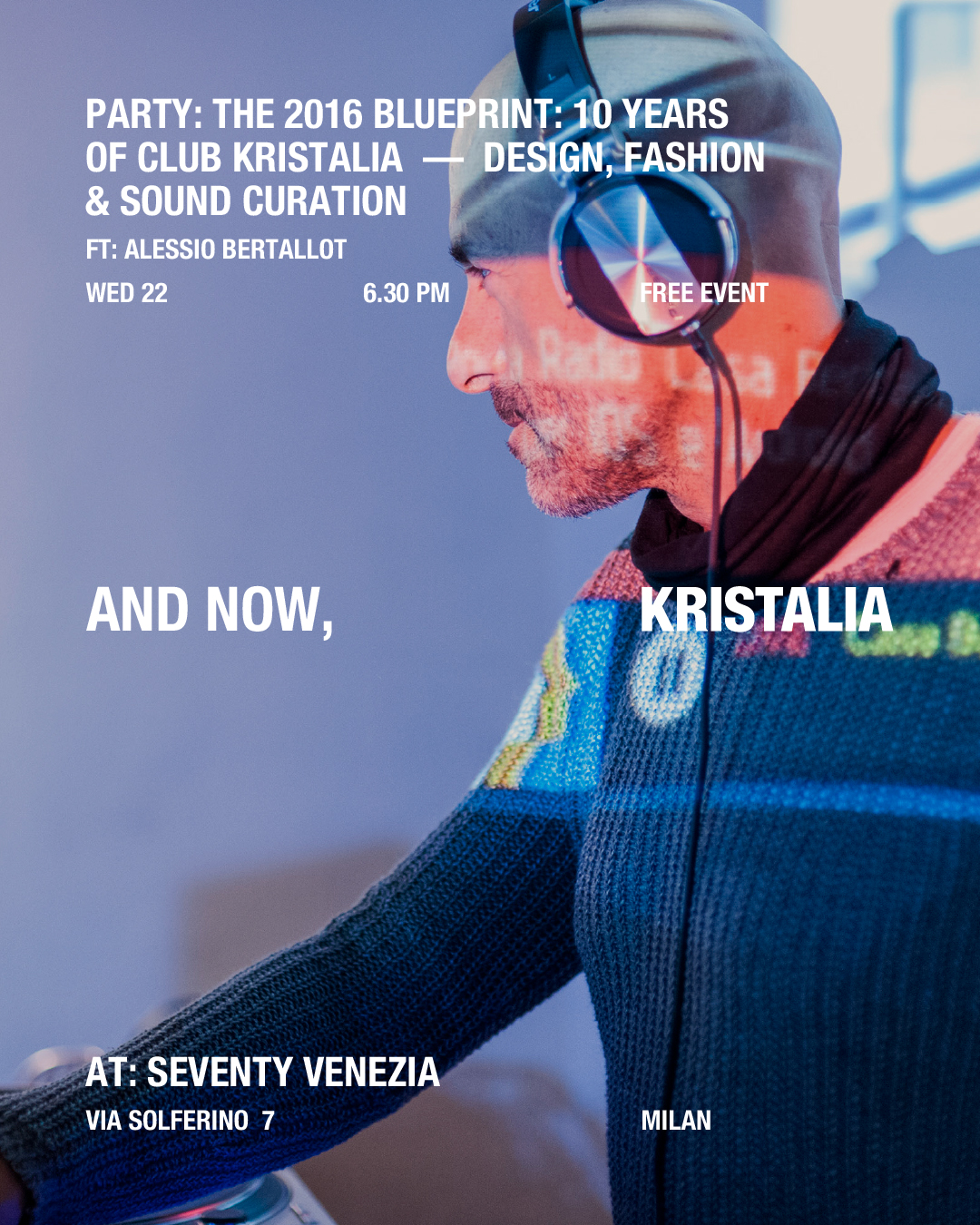 The 2016 Blueprint : 10 ans de Club Kristalia – Design, mode & sound curation. Sound Curation : Alessio Bertallot – musicien, DJ et pionnier de la diffusion musicale en Italie.